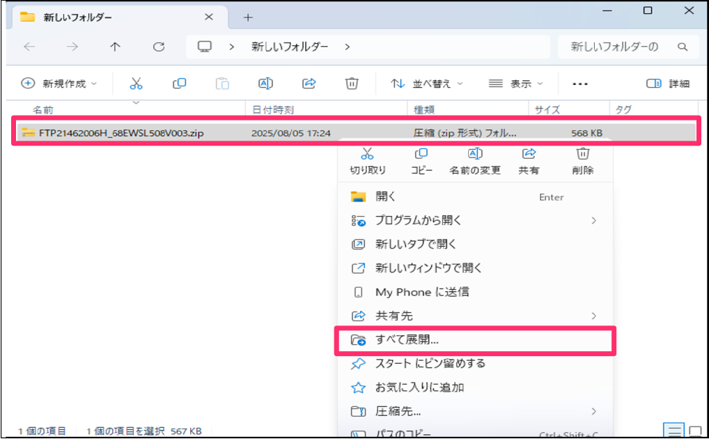 ① 「FTP21462006H_68EWSL508Vxxx.zip 」ファイルを右クリックし、「すべて展開」をクリックしま