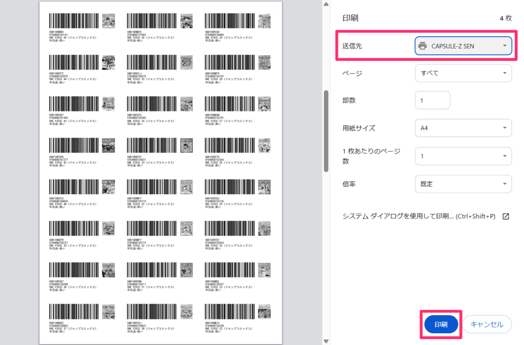 印刷する際には送信先をCAPSULE-Z SEN にして印刷をしてください。