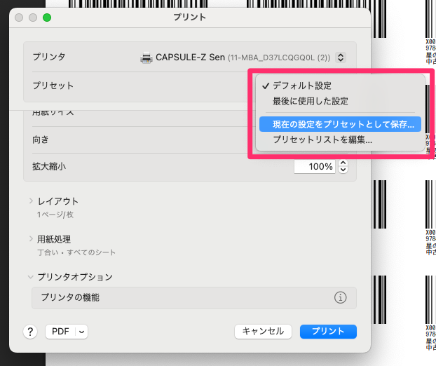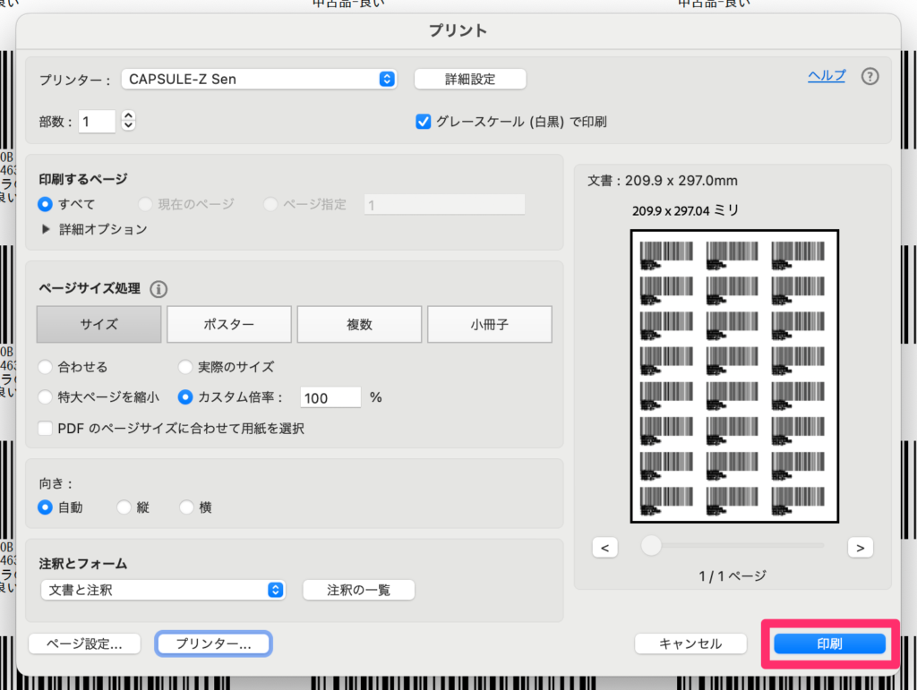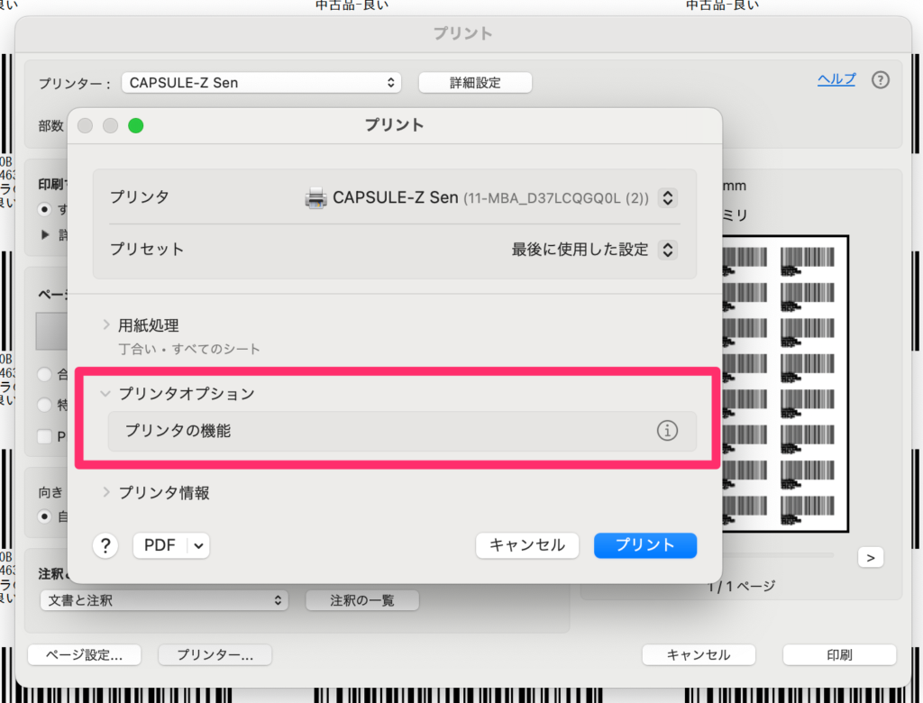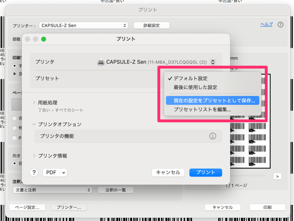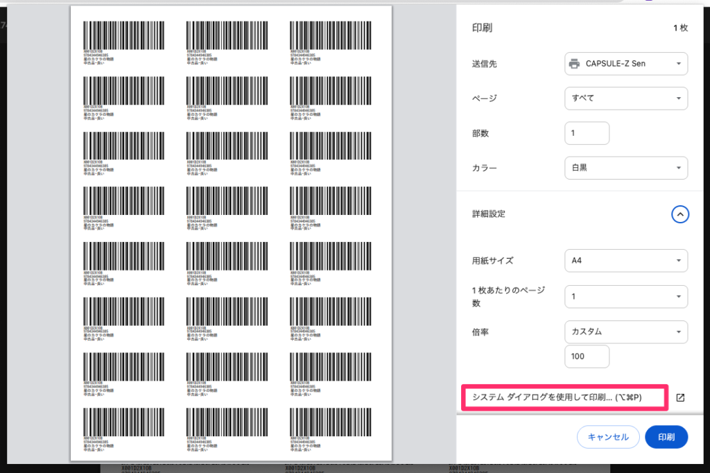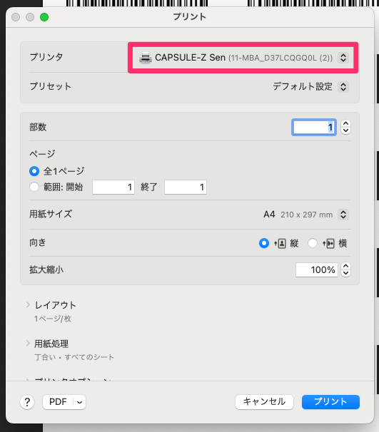 1-2. 下記の画面でプリンタを「CAPSULE-Z Sen」に設定します。