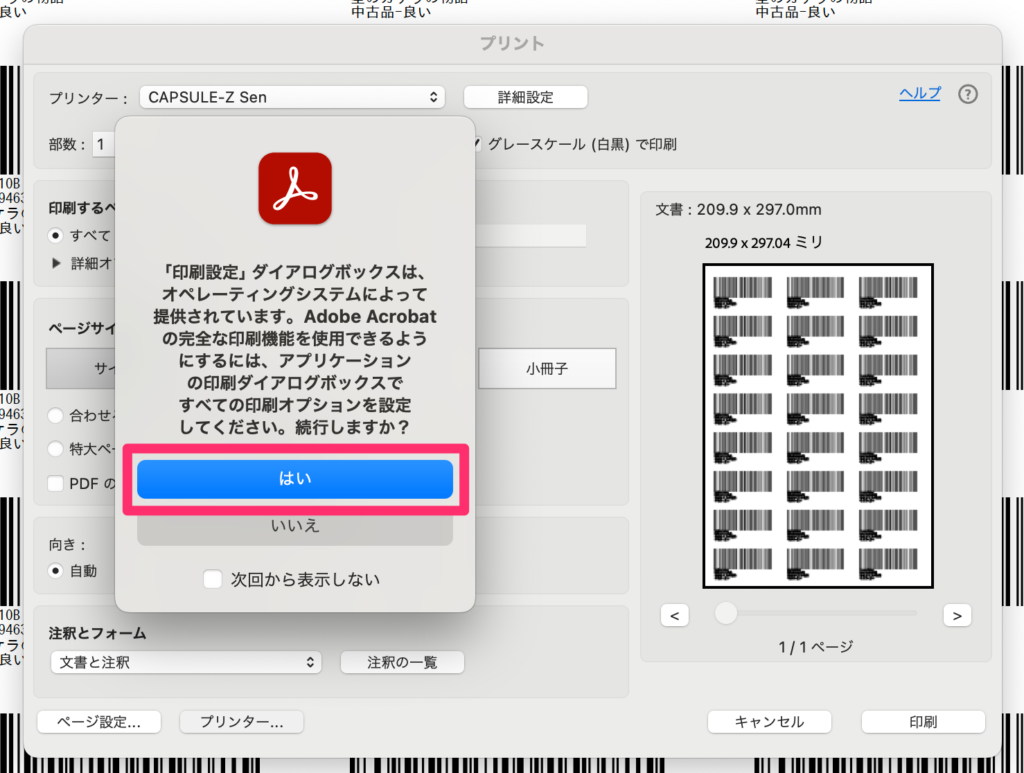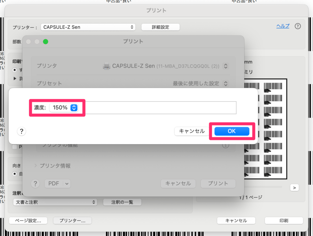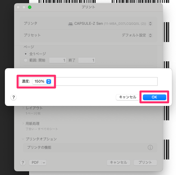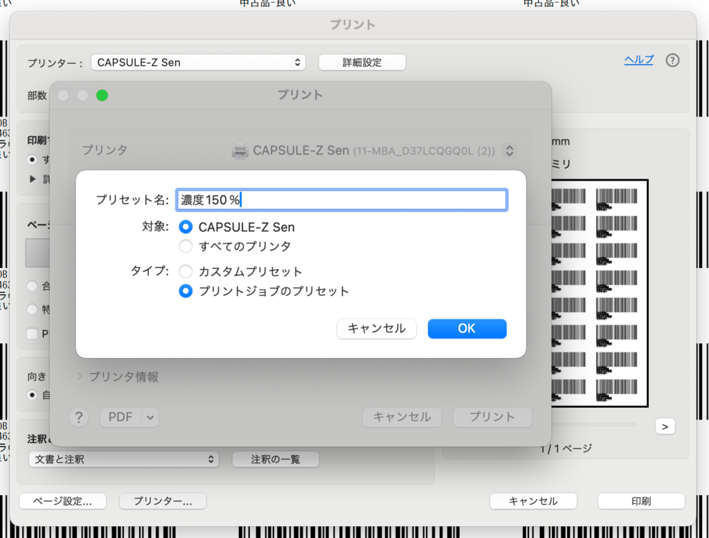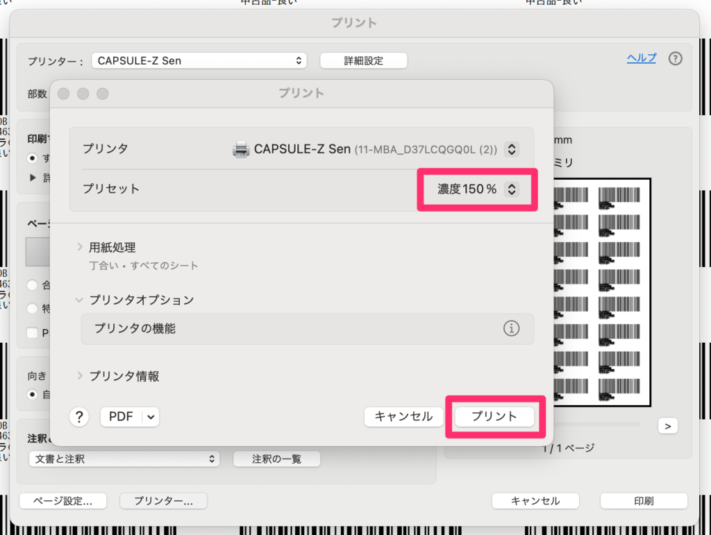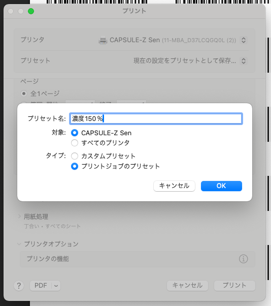 1-2. 下記の画面でプリンタを「CAPSULE-Z Sen」に設定します。
