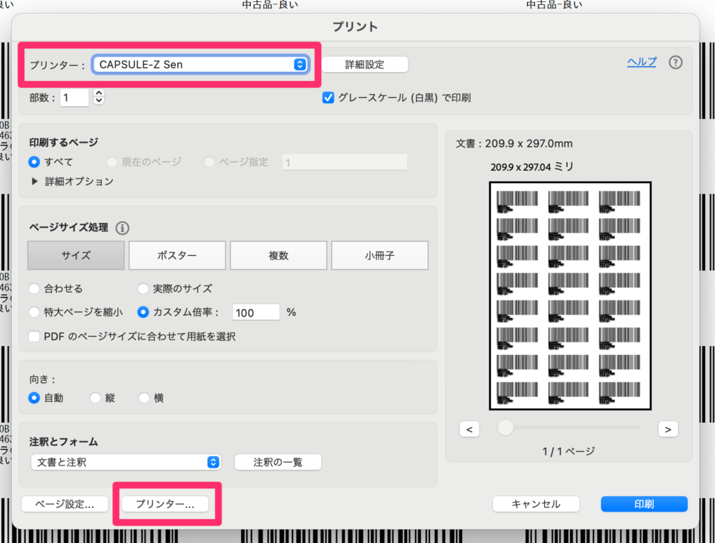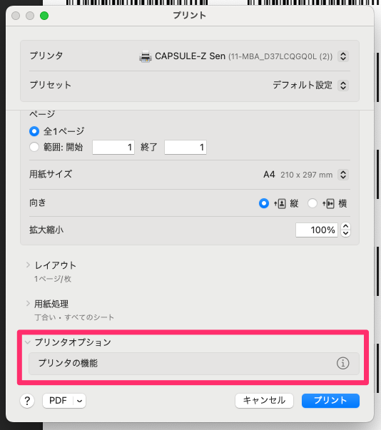 2-2. プリンターを「CAPSULE-Z Sen」に設定し、下部の「プリンター…」をクリックします。