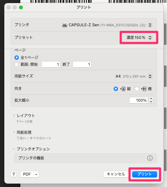 1-7. 設定したプリセットが選択されていることを確認して、「プリント」をクリックします。